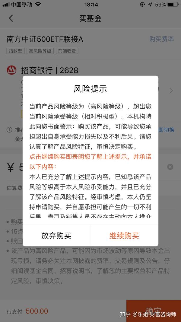 第五步,输入购买金额,点击“确定”,后会出现风险提示,选择“继续购买”