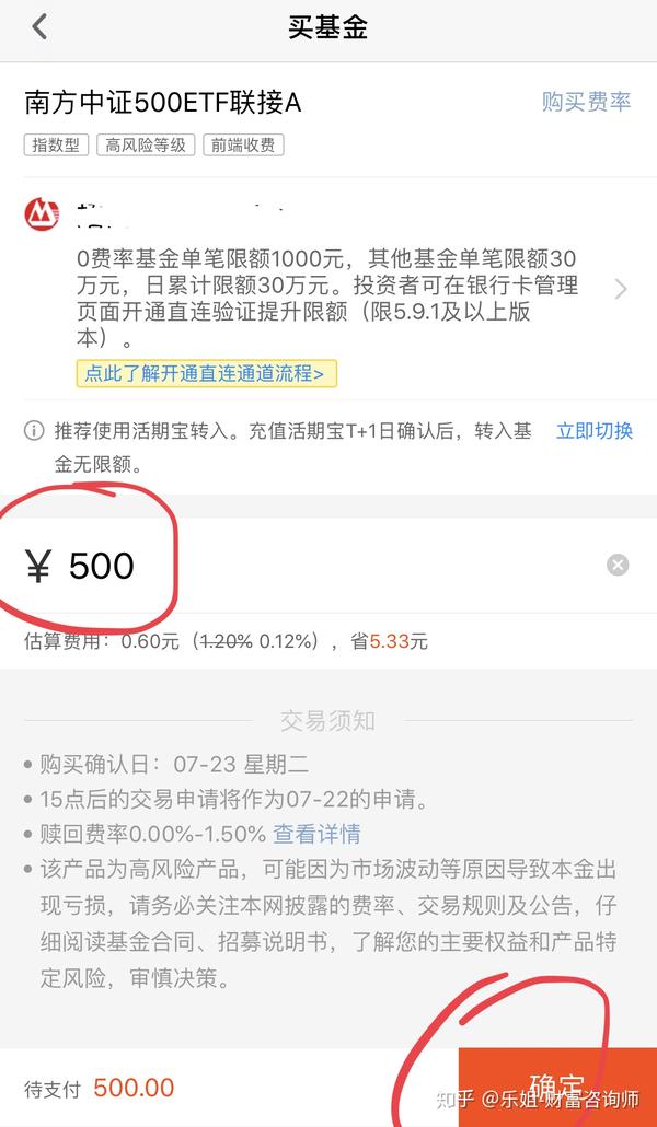 (这里有个关于活期宝的充值说明,如果使用活期宝,在你给活期宝充值T+1日后,转入基金是无限额的,而使用银行卡购买有限额。)