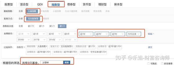 第4⃣️步,做细致筛选。搜索 框输入上证50,属于【大盘指数】,复制指数方式,我们就选择【完全复制型】,业绩排名在近3年,近2年,近1年选择排名前面1/4。